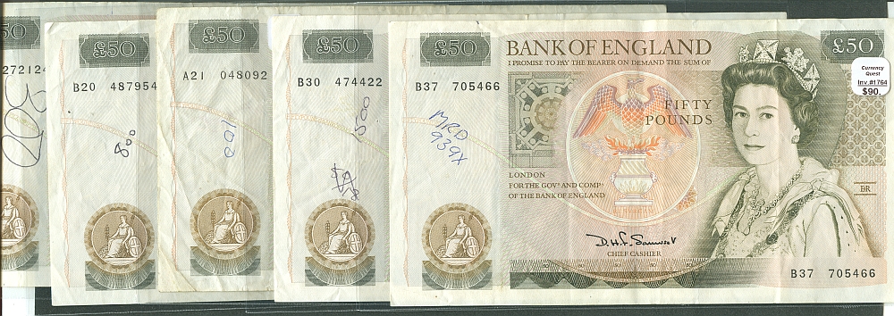 We have a small group of circulated notes with an average grade of VF to ChVF but impaired with minor numerical graffiti. Catalog price is $135 in VF. Priced little more than the current dollar/pound exchange rate. Satisfaction guaranteed.